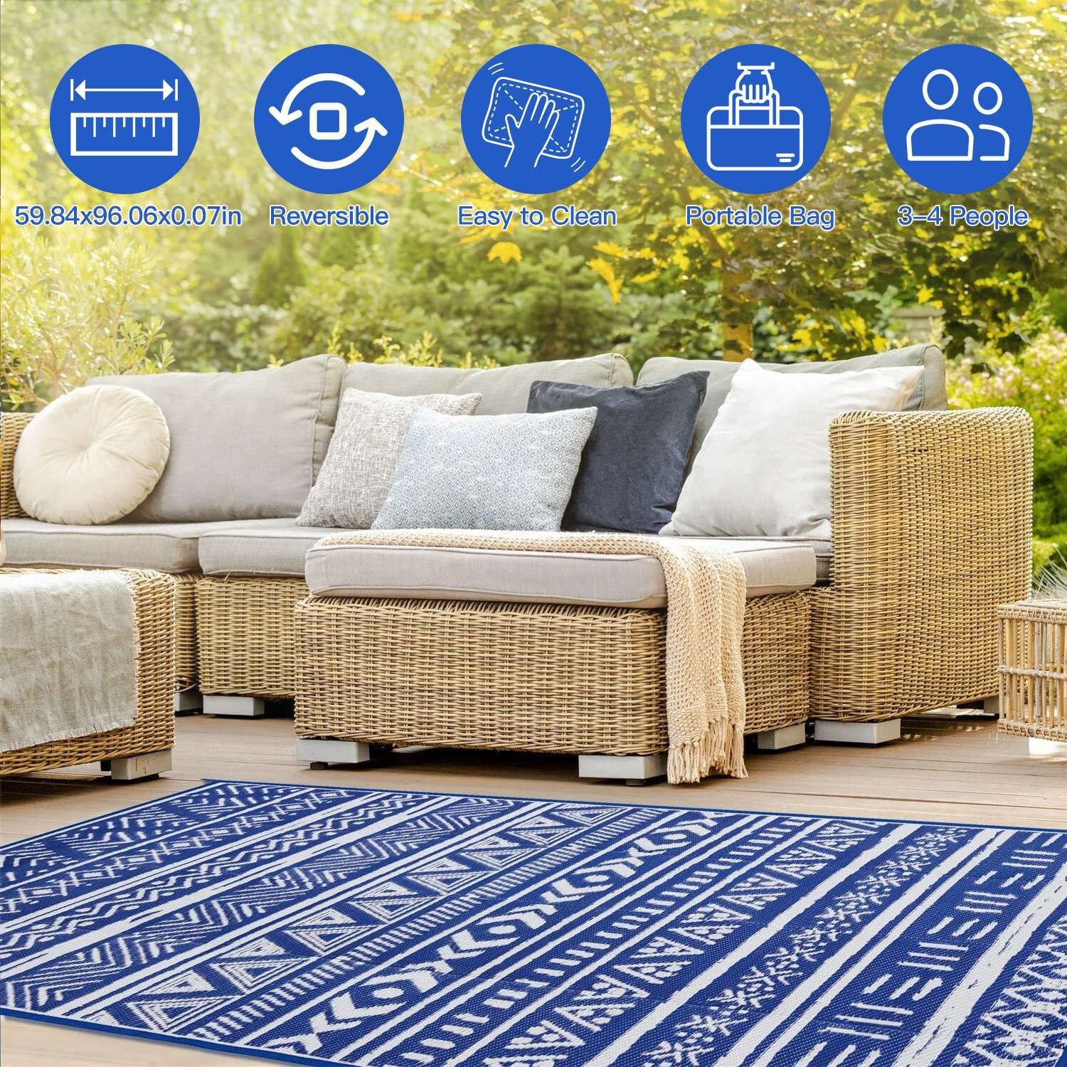 *Reversible Rug*:This 4.98x8FT mat is designed with blue and white geometric patterns on both sides,you can flip over to get a new one if one side is messy. Bohemian style makes it also a stylish decoration on floor,a large,affordable and practical outdoor or indoor rug.