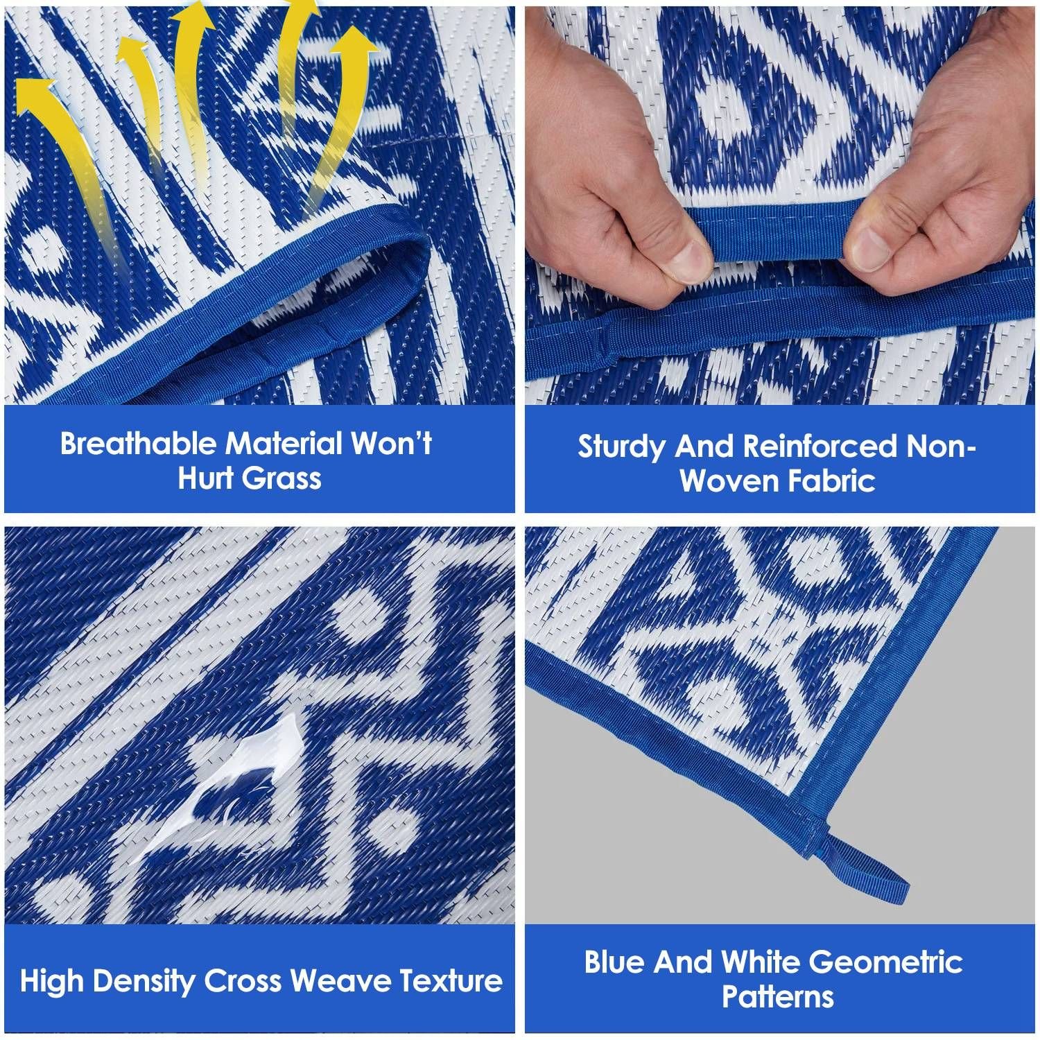*Easy to Clean*:Made of waterproof,stain-resistant,anti-fading and quick dry PP material,you can easily rinse or wipe the dirt,hair,spill,food and drink stains on the mat after use. A reusable outdoor rug provides you and your family with a clean and wide space in high-traffic areas.