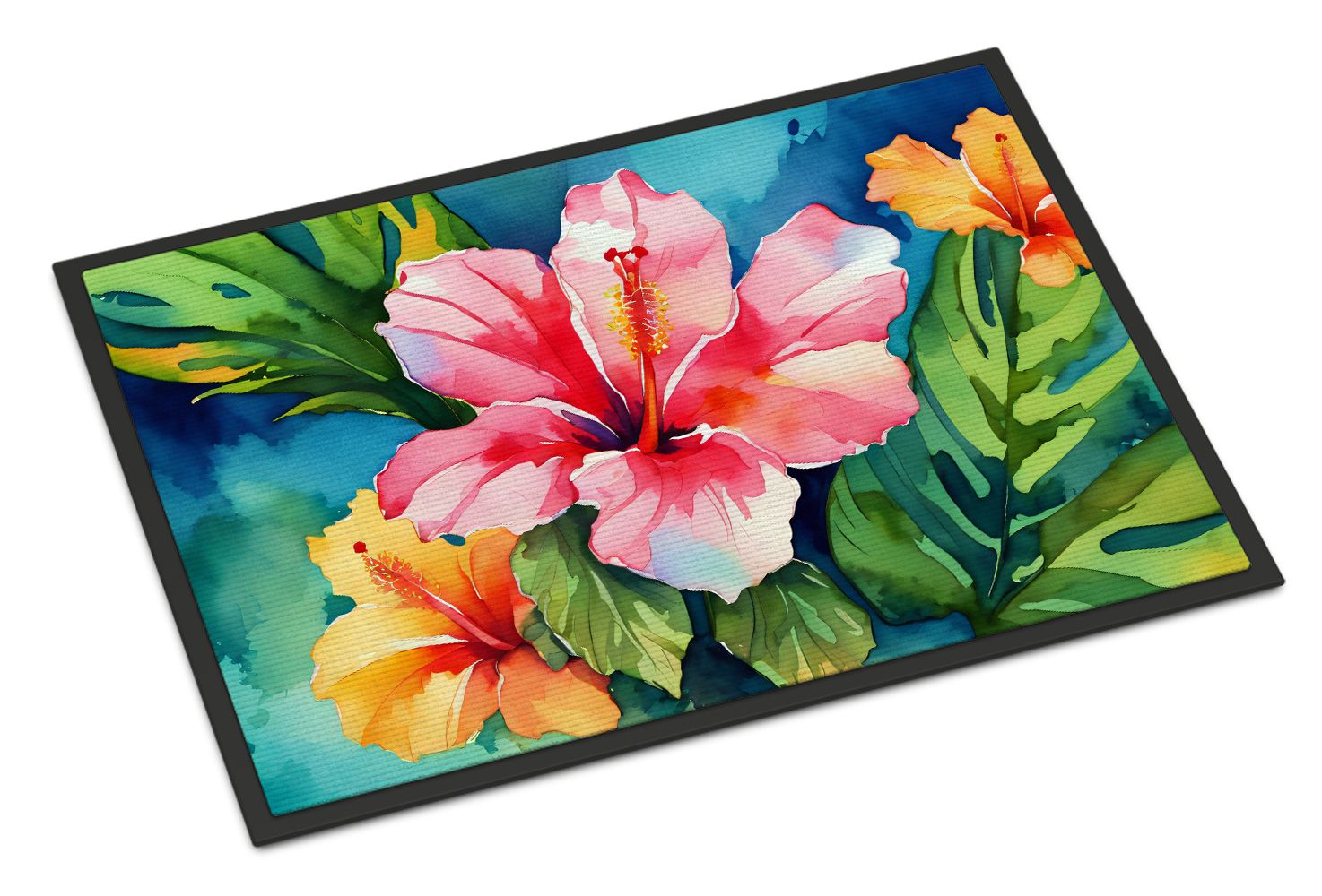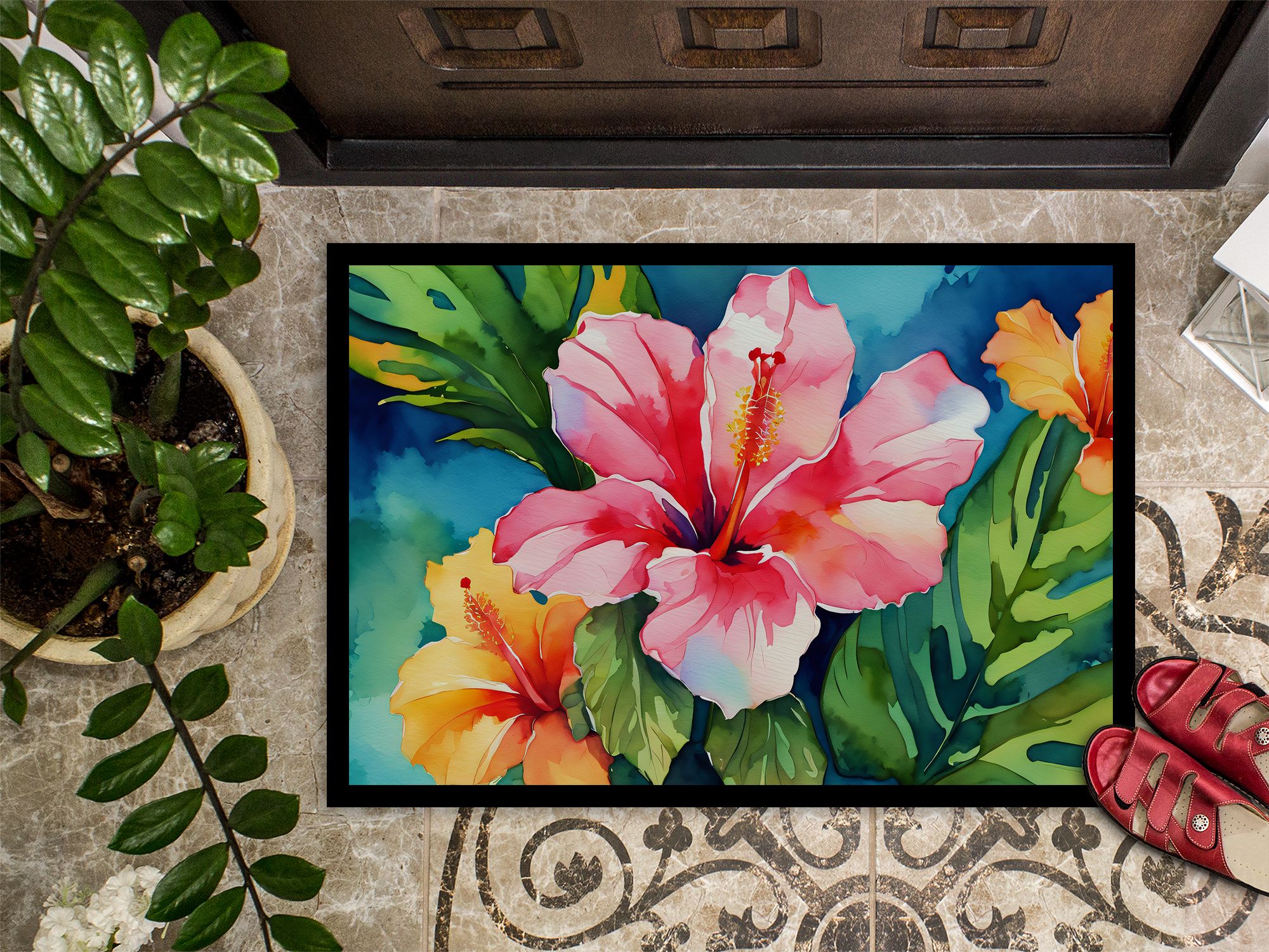 Home > Hawaii Hawaiian Hibiscus in Watercolor Doormat Front Door Mat Indoor Outdoor Rugs for Entryway, Non Slip Washable Low Pile, 24H X 36W
