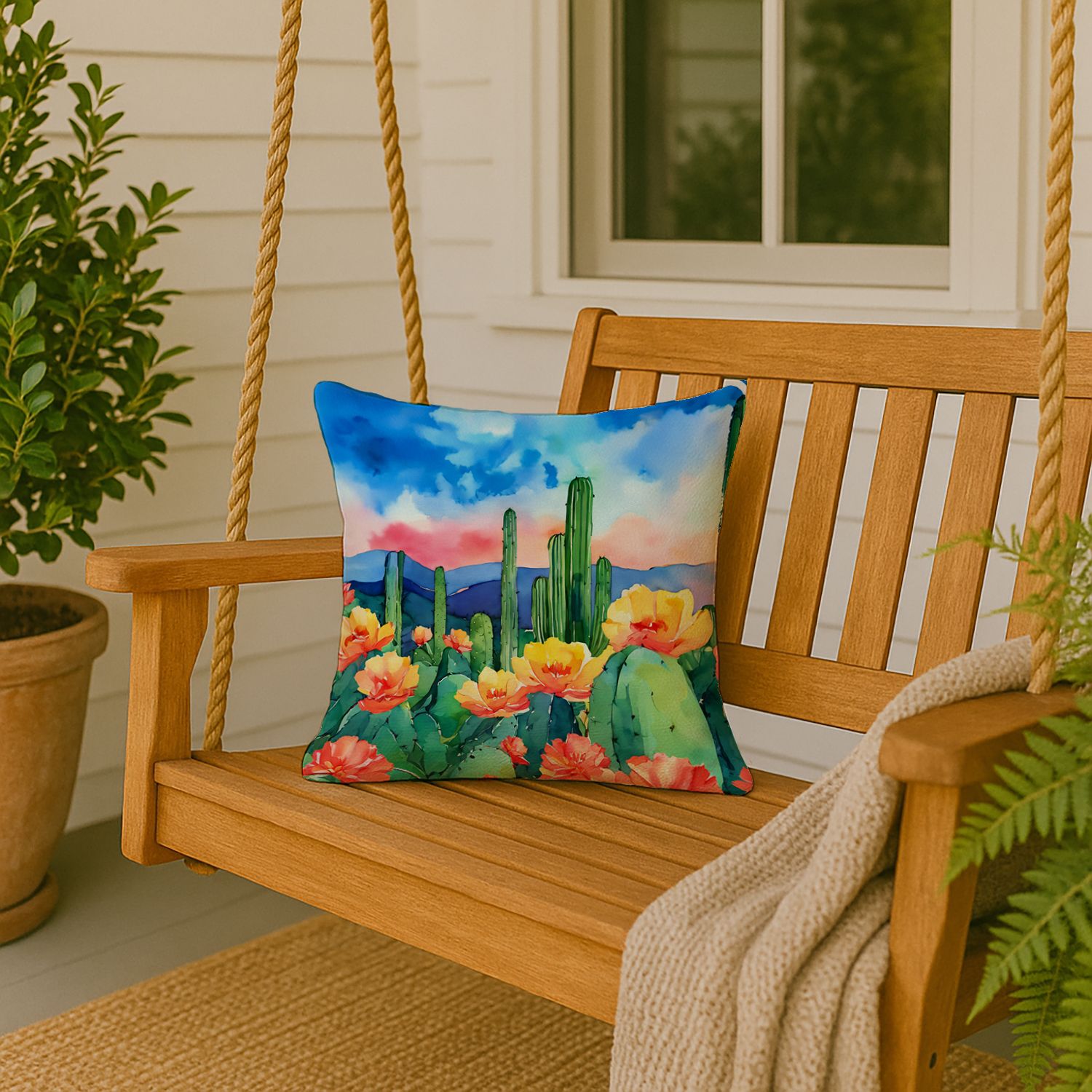 Throw Pillow featuring breed specific Arizona Saguaro Cactus Blossom artwork. Revitalize your outdoor or indoor living space with Caroline's Treasures 18x18 Fabric Decorative Pillow. With a generously sized dimension of approximately 18 inches by 18 inches, this pillow makes a comfortable and aesthetic addition to any seating area. Made from a unique, water-resistant material developed by Caroline's Treasures, the pillow sham is 100% polyester fabric that's durable and ready to weather any condition. Its vibrant, full-color artwork will not fade over time as it is dyed with color-fast dyes. Whether you place it on your patio furniture, porch, veranda, or indoor couch, its soft canvas fabric ensures a cozy experience. The pillow is handcrafted in the United States, featuring a sham created from three pieces of fabric and a polyester insert for enduring shape and overstuffed comfort. Despite being robustly built to endure the outdoors, it is as soft and snug as your favorite indoor cushions. Please note, as all our pillows are handmade, sizes may vary slightly, adding to the charm of this unique decorative item.