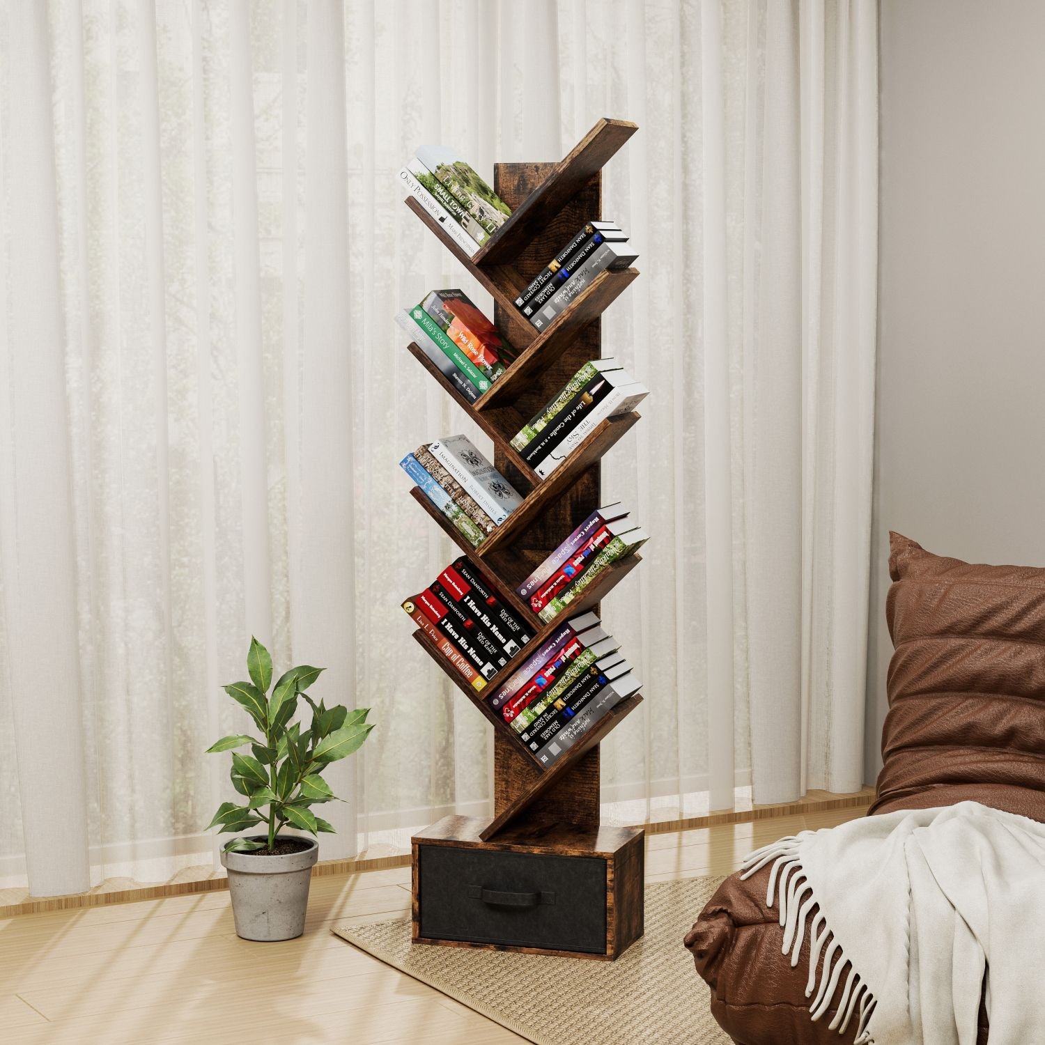Multifunctional Bookshelf: The tree bookshelf is not only featured with 9 tier shelves, but also with a drawer base, which can offer larger storage space to display your books, CDs, magazines, novels, decorations, towels or shoes, etc. Combined tree shaped design and vintage colors, our book tree bookshelf is also a decoration that can fit most home decor styles.