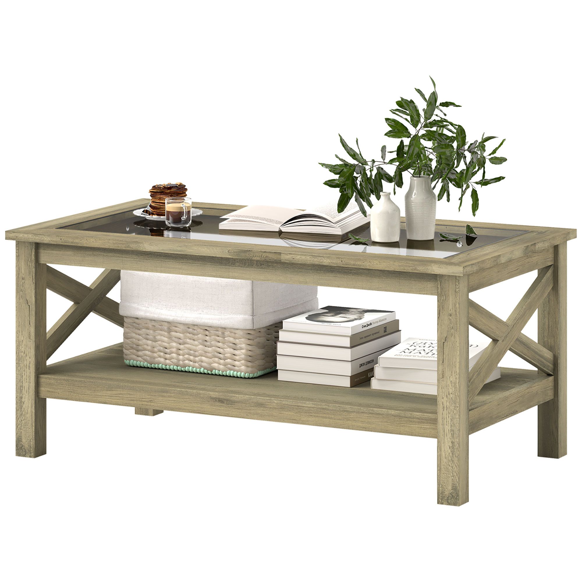 Looking for a beautiful glass-top coffee table to match your current home decor style? Add to your cottage-inspired living room furniture set with our HOMCOM coffee table. Featuring a cross X bar MDF frame, tempered glass tabletop, and a large bottom storage shelf, bring the style and functionality you're looking for. The subtle wood distressing on this country coffee table adds to the charm and will blend in easily with your home decor. Elevate your living room furniture with our farmhouse table from HomCom.